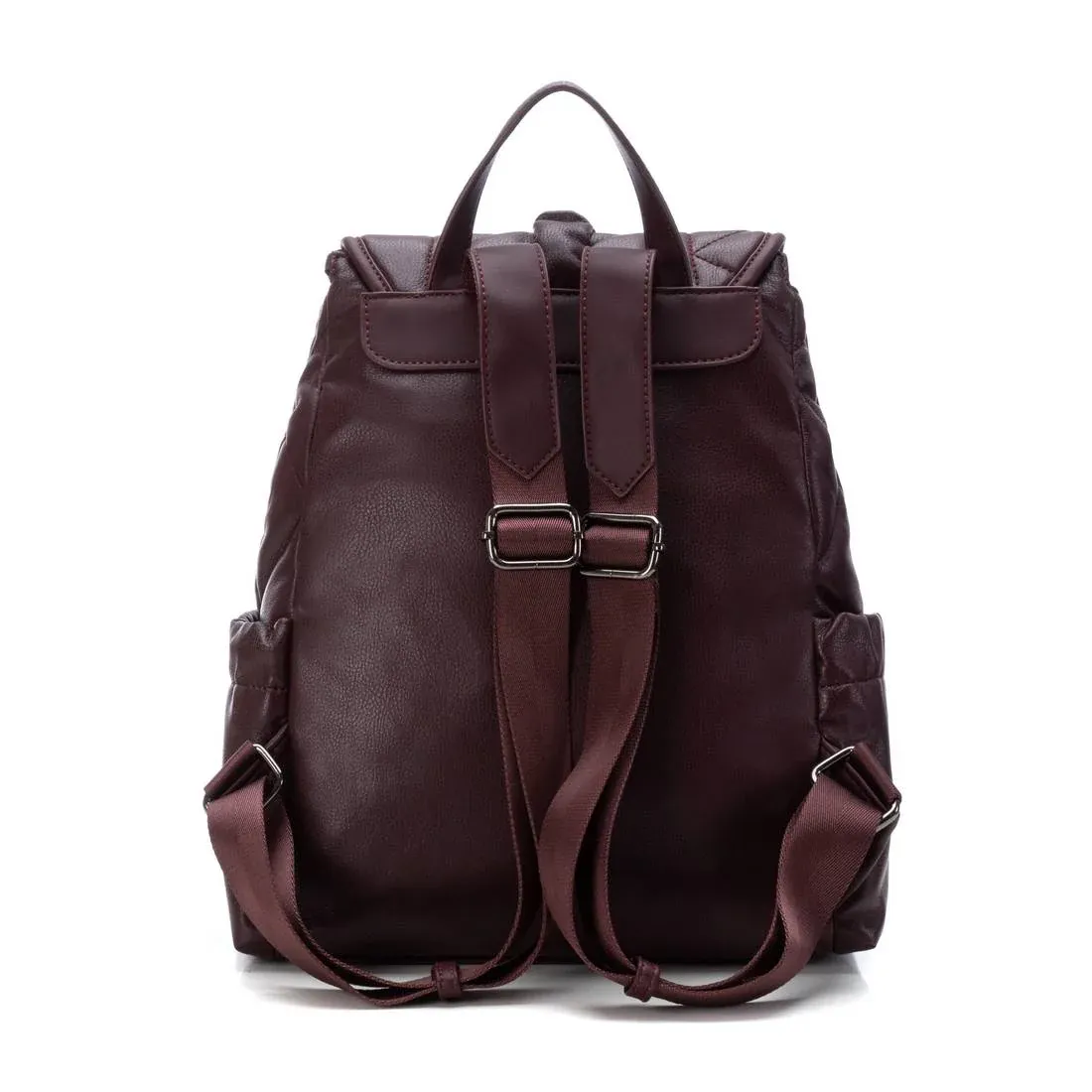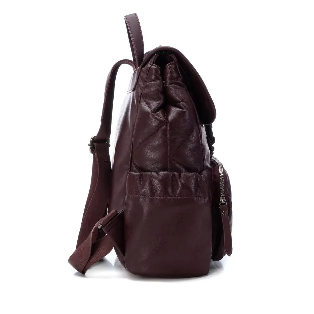 Mochila de mujer, de la marca Refresh. Fabricada en material acolchado que imita a la piel, con dibujo marcado por pespunte. Solapa con cierre y cremallera interior. 6 bolsillos. Medidas: 36 x 29 x 13. Este modelo ha obtenido el certificado vegano por la organización mundial PETA (Organización de los derechos de los animales).