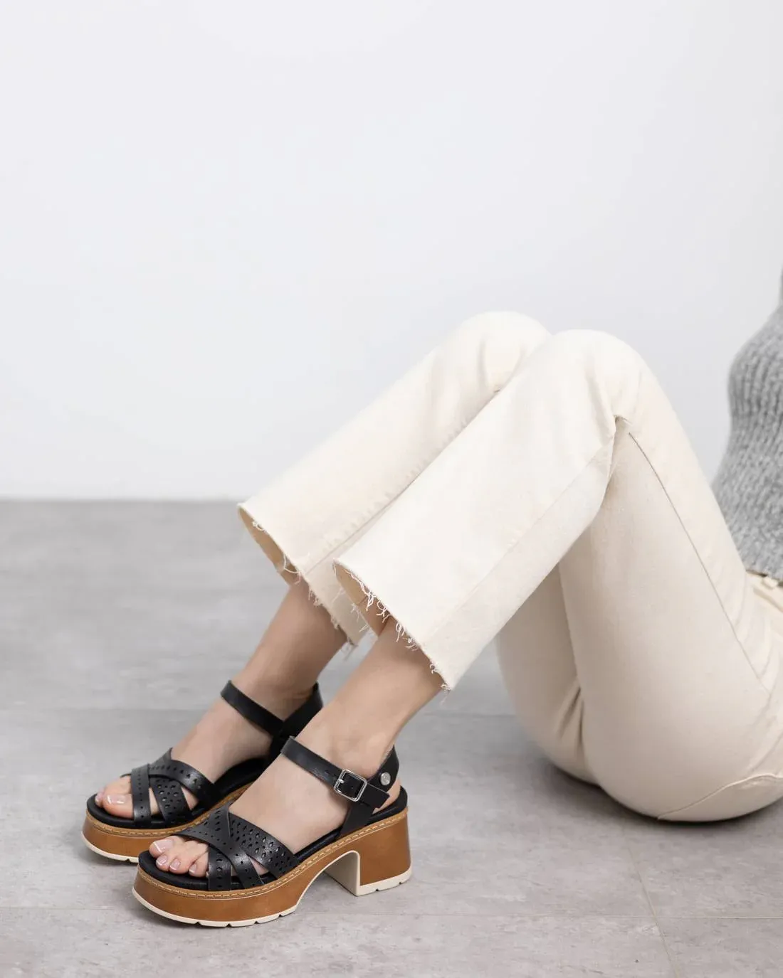 Sandalia de mujer, de la marca Refresh. Fabricada en material que imita a la piel. Pala multitiras combinadas con diferentes troqueles. Pulsera trasera para ajustar al tobillo. Cierre mediante hebilla. Cómoda planta. Tacón de 6 cm con plataforma para mayor comodidad. Suela de goma antideslizante. Este modelo ha obtenido el certificado vegano por la organización mundial PETA (Organización de los derechos de los animales).