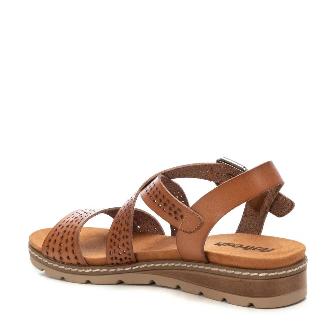 Sandalia de mujer de la marca Refresh. Fabricada en material que imita la piel con detalle calado. Correa cruzada con hebilla para un buen ajuste al pie. Suela de goma antideslizante. Este modelo ha obtenido el certificado vegano por la organización mundial PETA (Organización de los derechos de los animales).
